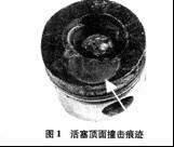 1.活塞和气门撞击造成的气门断裂。发动机工作中,在任何情况下,气门与活塞都不能发生接触,哪怕是轻微的接触也会导致气门断裂。其表现形式是:在活塞顶面与气门相对应的位置有和气门盘部尺寸相符合的重复撞击痕迹,在气门盘端面无积碳,呈旋转摩擦的光亮面,如图1所示。