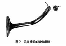 3.锁夹的内凹筋与气门锁夹槽形不符,将会啮伤锁夹槽,造成气门锁夹槽部断裂,其表现形式为锁夹槽部可见明显的啮伤痕迹,如图3所示。