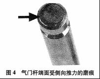 4.摇臂与气门接触位置不正确,气门杆端将会受侧向推力导致气门锁夹槽部断裂。其表现形式为气门杆端面可见明显的受侧向推力的磨痕,如图4所示。