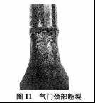 9.气门实际工作温度高于设计的发动机气门工作温度极限,导致气门局部材料退火,金相组织转变,机械强度降低、盘部变形和气门颈部断裂,如图11所示。