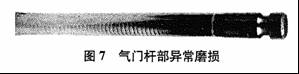 6.气门导管间隙超差。气门导管超过使用极限,将会造成气门在运动过程中摆动、杆部异常磨损、气门温度升高及落座不正受力不均匀等,导致气门失效,如图7所示。