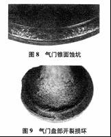 7.废气中不应存在的固体颗粒及异常的化学腐蚀物质以及高温导致气门锥面蚀坑,严重时会使气门锥面局部烧蚀或盘部开裂损坏,如图8和图9所示。