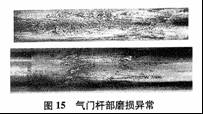 12.导管内孔与气门杆径尺寸间隙小于有关规定或润滑不良导致气门运动状态异常,磨损严重或气门损坏,如图15所示。